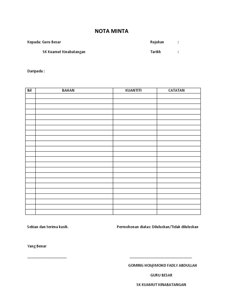 . -- Contoh Nota Minta 2010 Pdf Nota minta rujukan. PERAKAUAN Hendaklah dipenuhkan oleh sekolah Wajib diisi sebelum menyerahkan Invois dan Nota Minta spt contoh di bawah. 2016 Berhubung dengan perkara tersebut di atas diharap dapat tuan meluluskan permohonan.